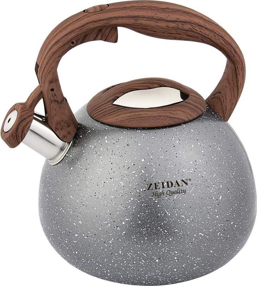 Чайник со свистком ZEIDAN Z-4229-02 серый 3,0 л, Чайник со свистком, 3,0 л, нержавеющая сталь, литой корпус, ИНДУКЦИОННОЕ ДНО, КУРКОВЫЙ МЕХАНИЗМ, внешнее антипригарное мраморное покрытие, устойчивое к высоким температурам; фиксированная прорезиненная ручка "под дерево". Подарочная упаковка.