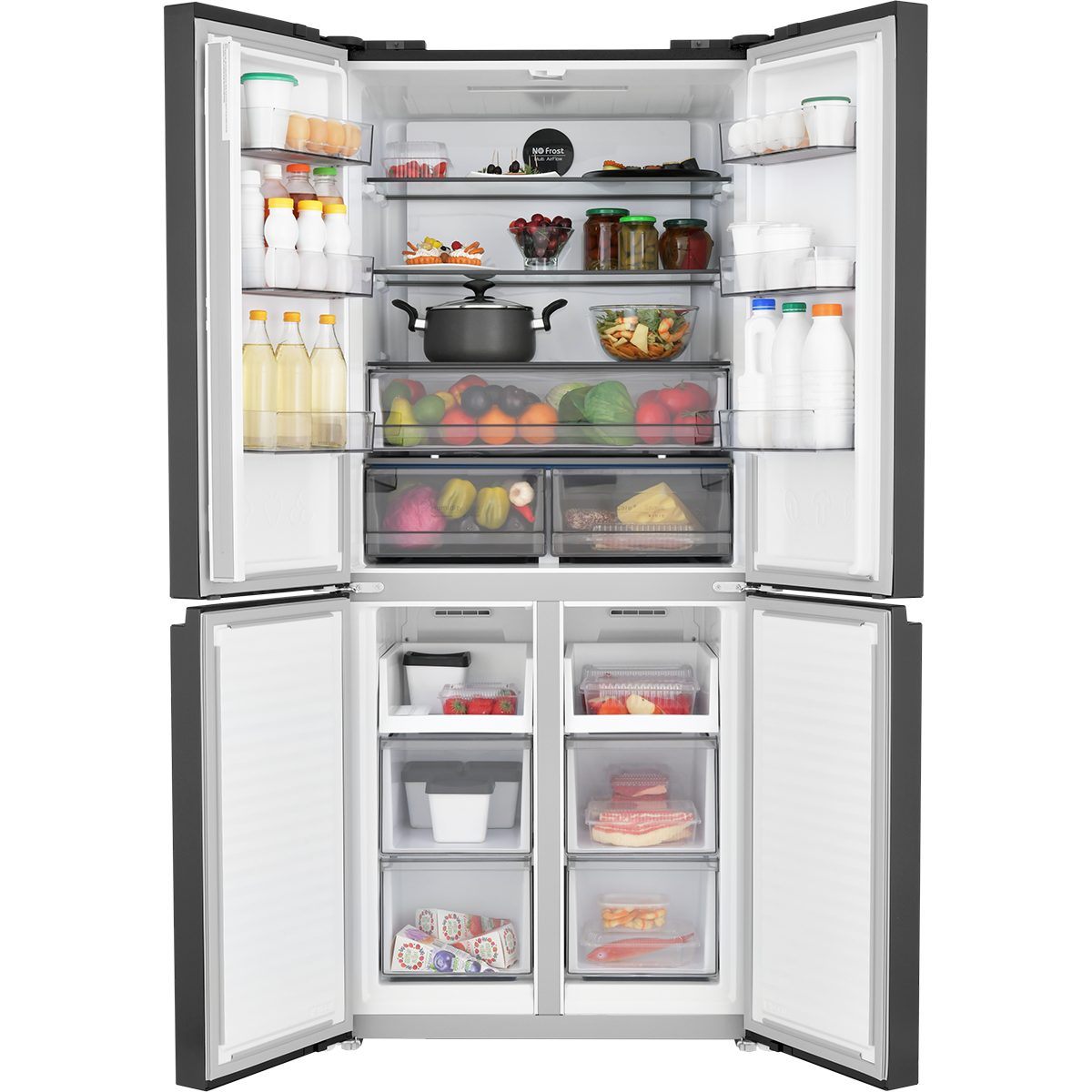 Черный матовый холодильник с четырьмя дверьми станет украшением любой кухни. Возможность открывания отдельной зоны сокращает потери температуры, а соответственно, экономит электропотребление. Стильный дизайн совмещён в модели с большим набором опций.