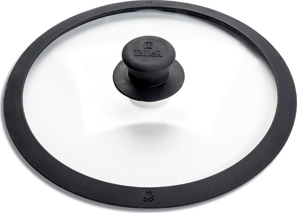 Крышка из жаропрочного стекла, диаметр 22см. Силиконовый обод с отверстиями для паровыпуска, силиконовая ручка. Нельзя использовать в духовке.