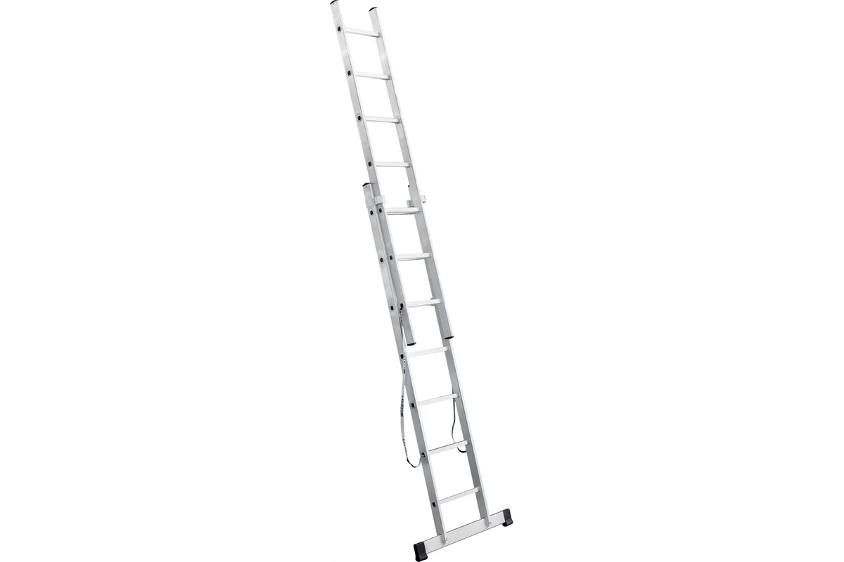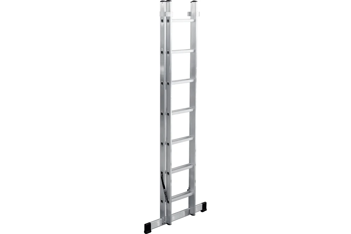 Имеет широкие алюминиевые скобы, обеспечивающие плотный зажим выносной секции и прочные страховочные стяжки, предохраняющие лестницу от самопроизвольного раскладывания.